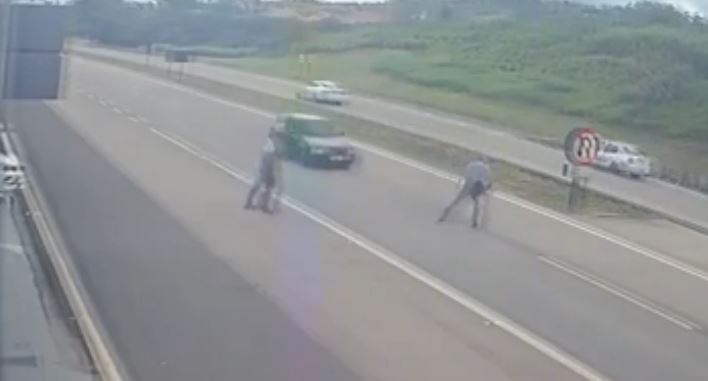Ao perceber que o homem não pararia, o PM tenta sair da pista, mas é tarde demais. Ele é atingido em cheio, e um colega o socorre.