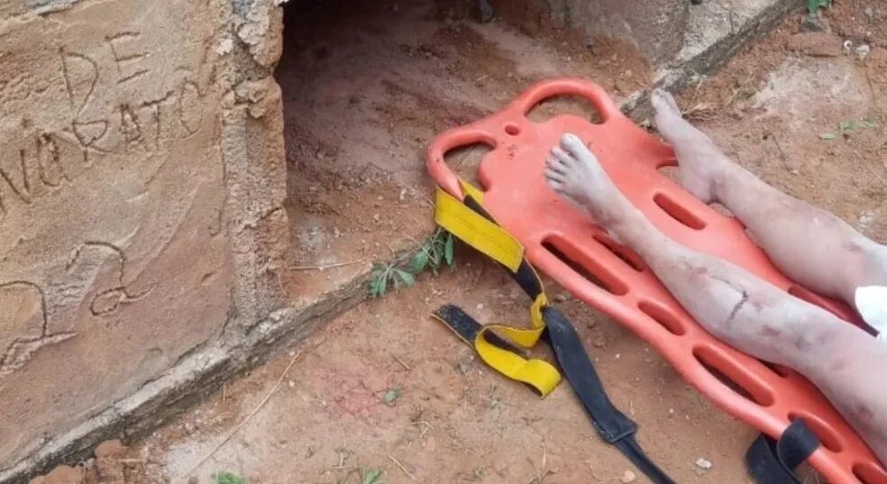 A vítima foi localizada na última terça-feira (28) após passar pelo menos 10 horas presa na sepultura. Coveiros acionaram a PM (Polícia Milita) após encontrar um túmulo fechado com tijolo e cimento fresco, além de vestígios de sangue. Eles também ouviram uma voz vinda da gaveta funerária.