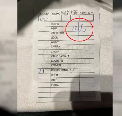 Ele chamou o garçom e pediu explicações. Segundo o servidor, o atendente se mostrou muito nervoso e disse que não sabia quem tinha escrito aquilo, mas achava que era uma referência à cor de sua camisa. “Mas a minha camisa era cinza! E se fosse realmente uma referência à ela, não deveria estar escrito com a palavra no feminino? Por que não estava escrito a cor da camisa na comanda de mais ninguém?”, disse.