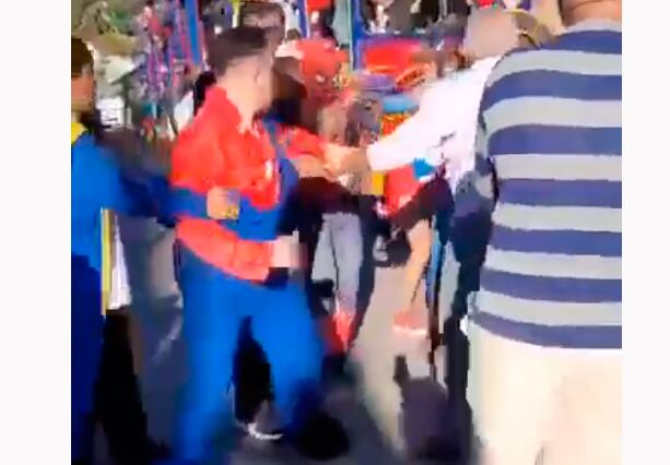 Mas no último domingo a animação ficou de lado e alguns personagens trocaram socos. Em um vídeo que circulou pela Internet, é possível ver quando o homem que se veste como Homem-Aranha se aproxima do Pantera Negra e passa a agredi-lo. O homem que se veste como Super Mario tenta apartar a briga, e acaba também trocando socos com o homem-aranha.