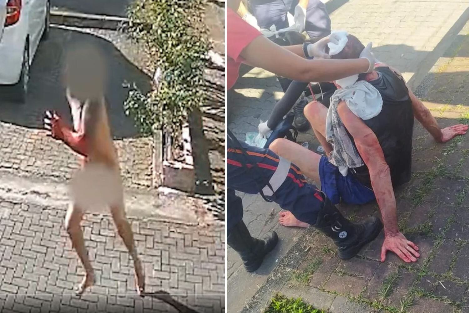 Quando eles estavam no térreo, a irmã e o marido tentaram fechar uma porta ao perceber a aproximação do homem pelado, mas ele conseguiu abri-la e partiu para cima da mulher, que sofreu cortes nas mãos. Depois disso, o marido dela conseguiu entrar em luta corporal contra o agressor e o imobilizou.