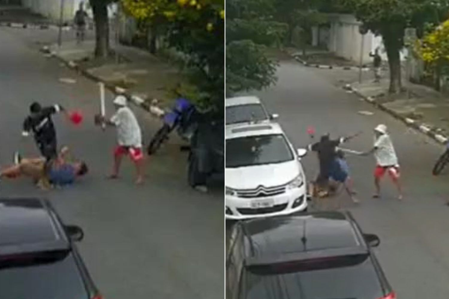 Um idoso reagiu ao ver um homem sendo alvo de criminosos, em São Vicente, no litoral de São Paulo. Um vídeo gravado por câmeras de segurança mostra quando a vítima foi abordada pelos bandidos, que pretendiam levar o carro. A testemunha se aproximou a partiu para cima deles com a bengala. Um deles fugiu, mas o outro foi rendido e preso (assista abaixo).