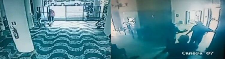 Conforme mostrado nas imagens de câmera de segurança do condomínio, o idoso chega no prédio com dois cachorros e em seguida, sofre as agressões.
