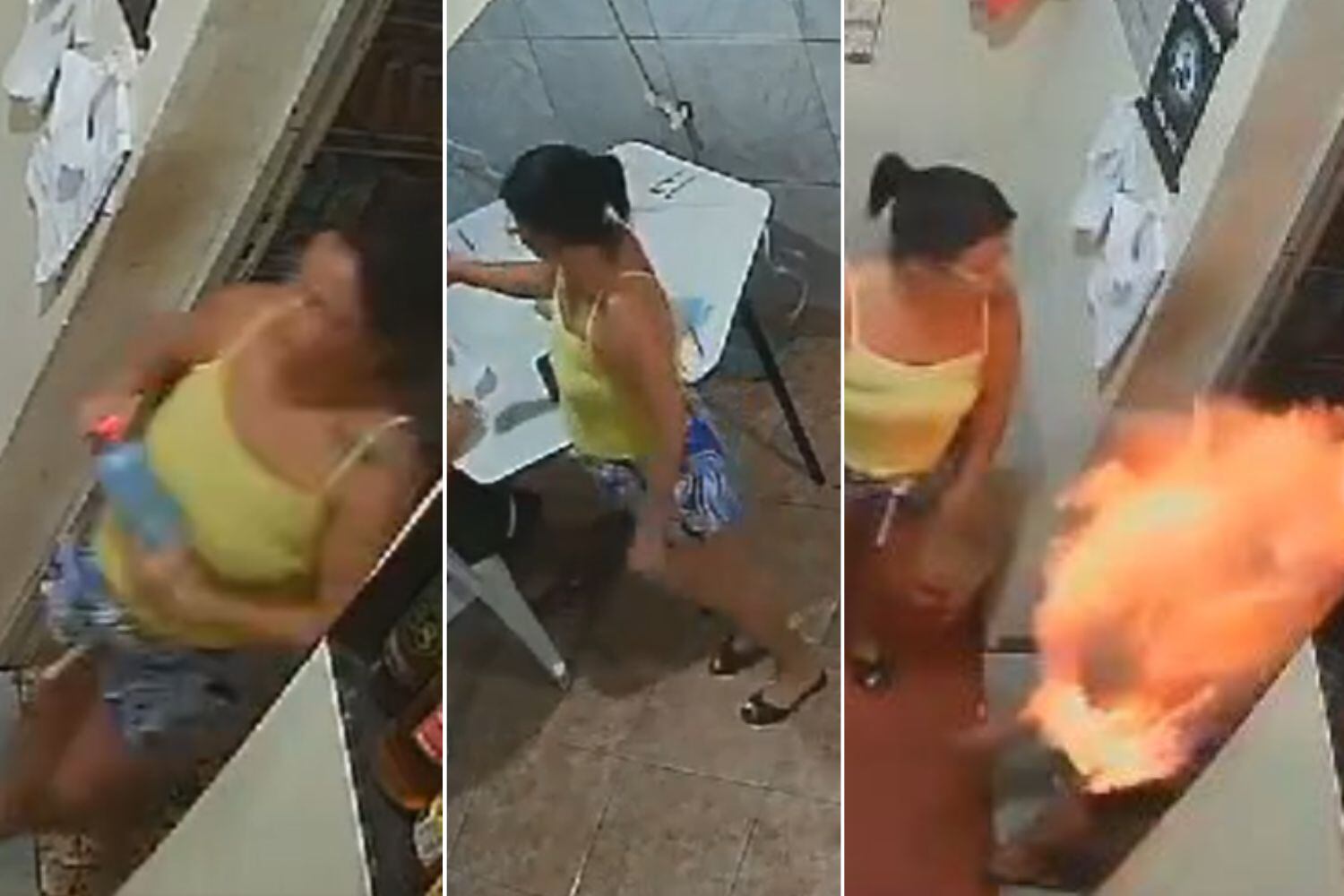 O caso aconteceu na madrugada da última segunda-feira (4), na Rua Cari Levi. O vídeo que circula nas redes sociais mostra quando a mulher entra no local com uma garrafa nas mãos. Ela caminha direto na direção do homem, que estava sentado em uma mesa. Eles parecem trocar algumas palavras, enquanto ela passa a jogar o líquido contra ele. Na sequência, usou um isqueiro para atear o fogo contra o alvo.