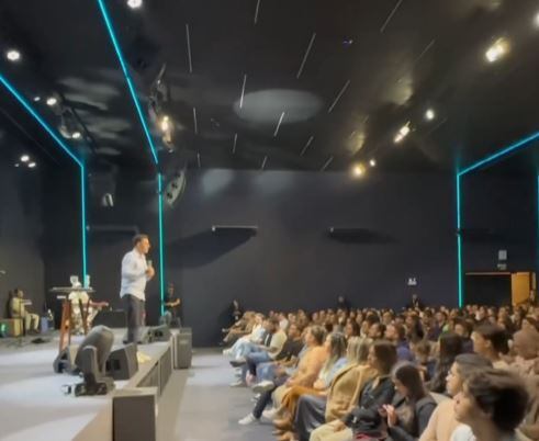 Por dentro, o espaço onde acontecem os cultos é composto por paredes pretas permeadas de luzes de neon que deixam o local com “ares de balada”. No palco, equipamentos modernos e uma grande equipe entoam louvores e presidem o culto.