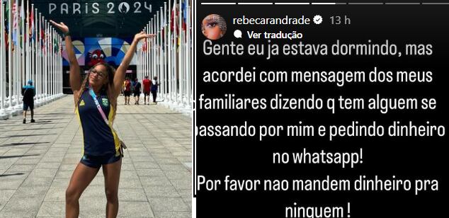 Rebeca Andrade, que conquistou o bronze na ginástica artística por equipes nas Olimpíadas de Paris 2024, utilizou seus Instagram durante a madrugada para informar que estão se passando por ela para aplicar golpes em seus familiares.
