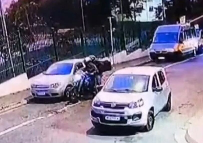 O veículo estava estacionado próximo à escola, quando um dos suspeitos passou pelo local de moto. Uma outra motocicleta, dessa vez com dois acusados, estacionou ao lado da porta do motorista. O garupa, que portava uma mochila de entregas, efetuou os disparos contra a vítima.