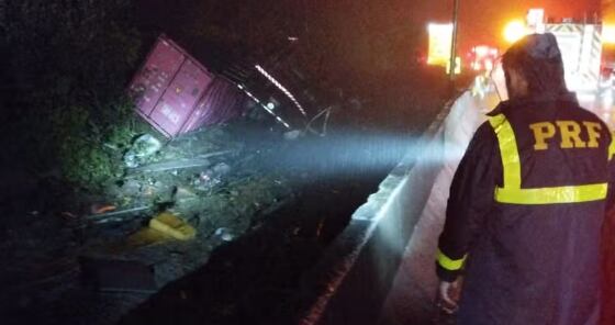 Até o começo da manhã desta segunda (21), a PRF ainda aguardava a chegada de um guindaste para içar a carreta com os contêineres e retirar os corpos. A pista ainda não foi liberada.