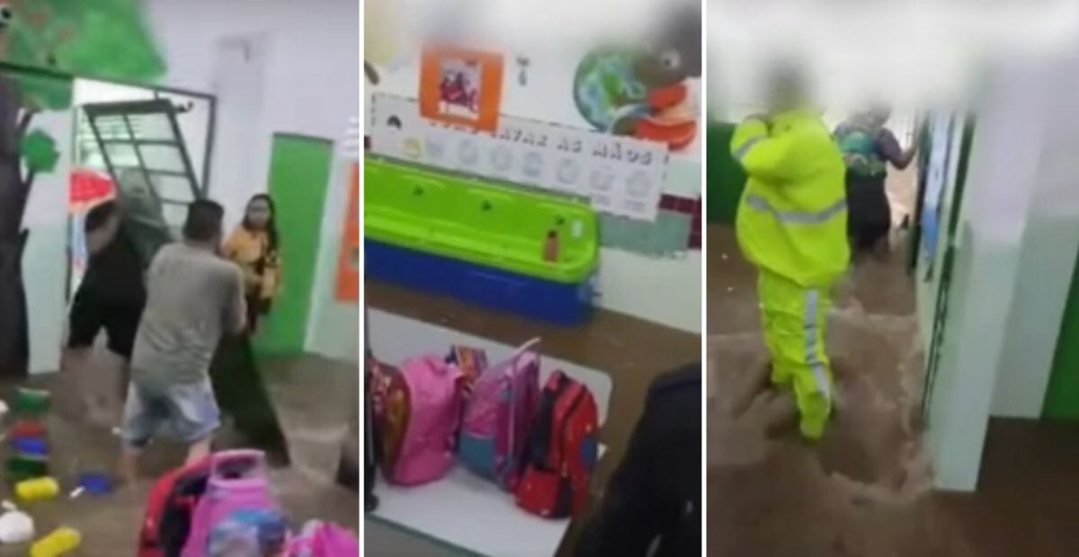 A enxurrada invadiu a Creche Alzira Silva Medeiros, que atende cerca de 120 alunos. Em um dos vídeos é possível ver o desespero dos funcionários, enquanto pediam por socorro e tiravam os pequenos, ilhados pela água. ‘’Misericórdia, meu Deus do céu. Tira as crianças, coloca para fora, coloca tudo dentro do ônibus’', dizia uma mulher.