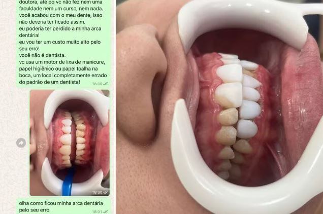 Foi então que Agatha decidiu buscar ajuda da irmã, que é estudante de odontologia, e foi orientada a buscar uma outra clínica com urgência. No local, ela recebeu orientações e seguiu com o tratamento em casa. Ao entrar em contato com Andreza, ela conta que a mulher se recusou a admitir que o procedimento tenha causado os problemas: “Ela mentiu bastante. Falou que fiz muito mais coisa lá do que as lentes, que ela fez mais trabalhos na minha boca”.