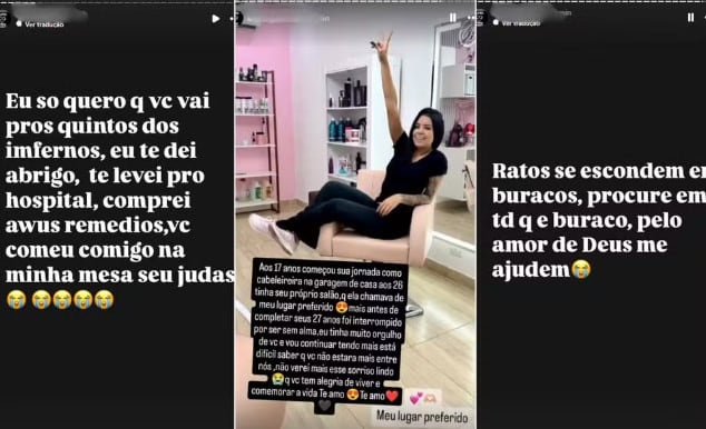 A mãe da empresária Brenda Bulhões, morta a tiros em frente ao próprio salão de beleza em Guarujá, no litoral de São Paulo, à luz do dia, usou as redes sociais para desabafar sobre o crime. Em uma série de publicações, ela pediu ajuda para capturar o principal suspeito, ex-companheiro da filha, e o chamou de ‘rato’: “Ratos se escondem em buracos, procure em tudo que é buraco, pelo amor de Deus, me ajudem”, escreveu.