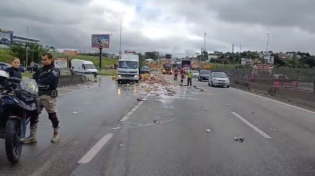 Além da cerveja, caixas de panetone caíram no local bloqueando a passagem dos demais veículos. Apesar do ocorrido, não foram registrados acidentes em decorrência do incidente ou feridos.
