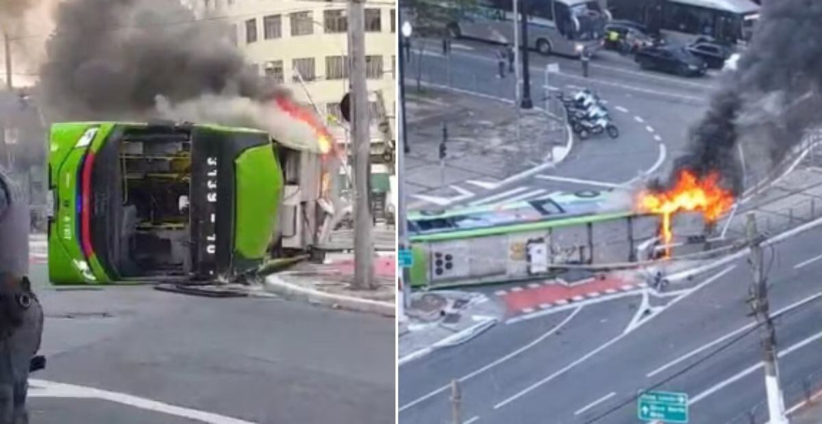 Um ônibus elétrico pegou fogo após tombar na Praça João Mendes, no bairro da Sé, no Centro de São Paulo, na tarde de quinta-feira (12). De acordo com o Corpo de Bombeiros, três pessoas ficaram feridas e foram socorridas, sendo que entre elas está uma mulher grávida. A corporação logo controlou as chamas e agora as causas do acidente são apuradas.