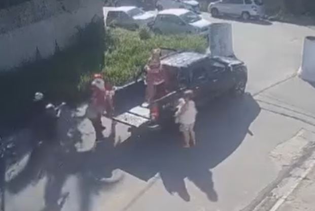 Imagens de uma câmera de segurança mostram o momento em que uma dupla chega em uma moto e aborda o grupo que estava em uma caminhonete, por volta das 15h40, na Rua 13. Os assaltantes levaram os celulares de todos que estavam envolvidos na ação e saíram tranquilamente do local.