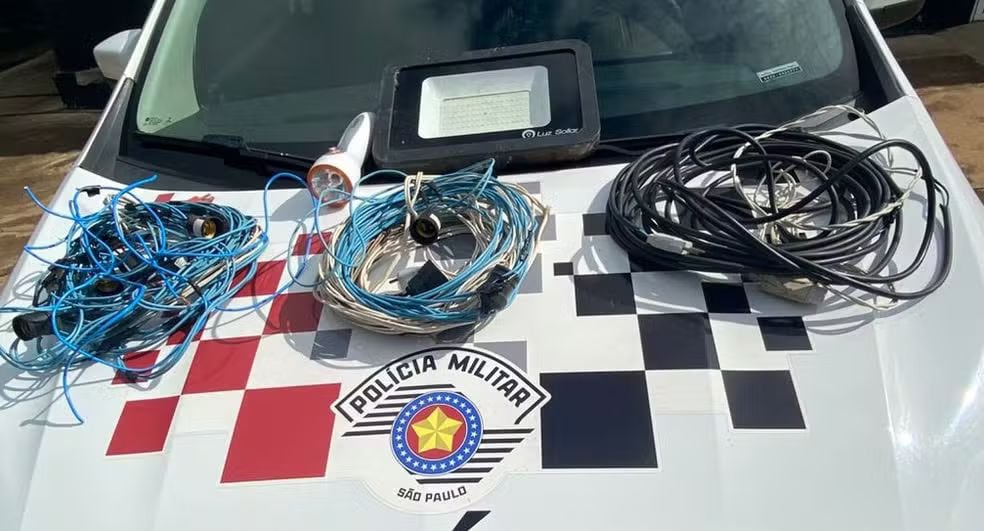 Durante a abordagem, os agentes encontraram na posse do suspeito cinco extensões, uma luminária grande e uma lanterna que estavam dentro de um saco de lixo. Ele foi reconhecido e preso.