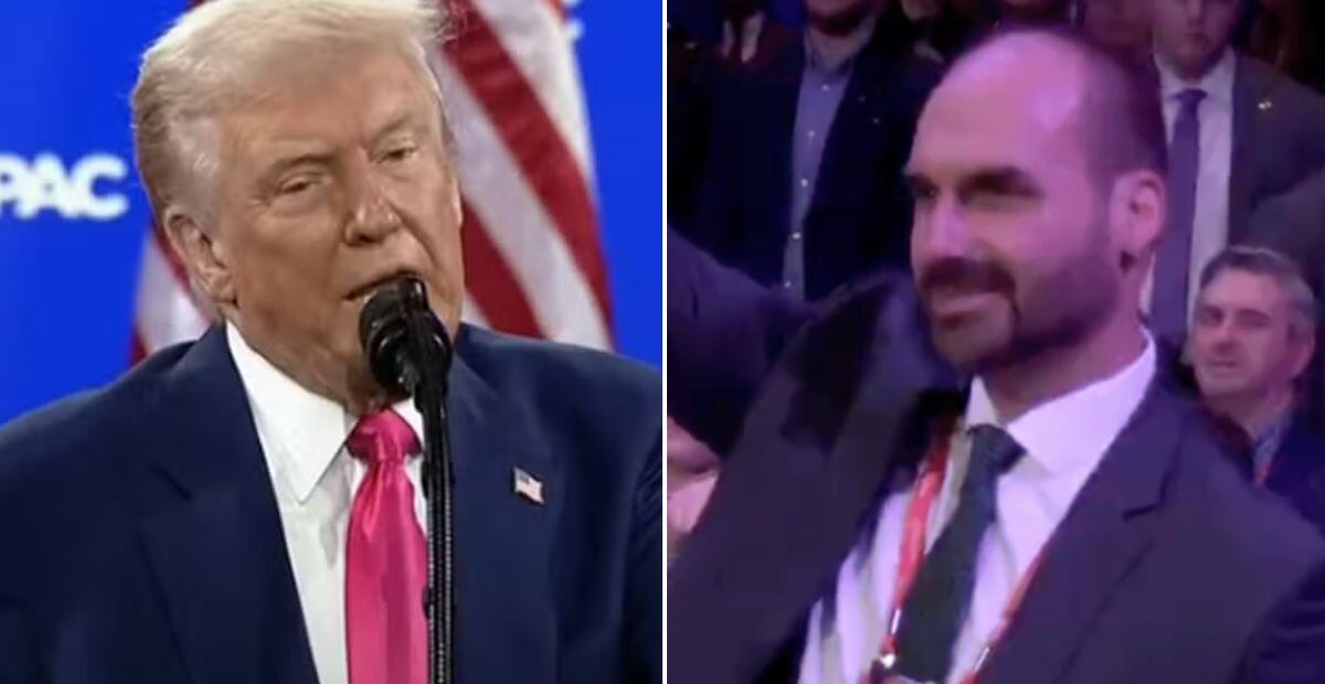 O deputado federal Eduardo Bolsonaro (PL-SP) celebrou nas redes sociais após ser cumprimentado pelo presidente dos Estados Unidos, Donald Trump, durante a Conferência de Ação Política Conservadora (Cpac), realizada em Washington. Logo no início do seu discurso, no sábado (22), o norte-americano elogiou a família do ex-presidente Jair Bolsonaro.