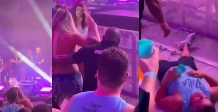 Imediatamente o homem cai no chão desacordado enquanto os seguranças e outras pessoas tentam segurar a mulher e impedir novos golpes. Veja as imagens: