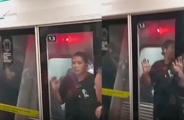 Em um vídeo que circula nas redes sociais, é possível ver a mulher entre a porta e o trem, conversando com funcionários que tentavam orientá-la.