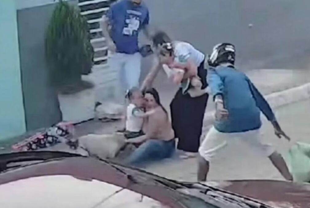 Em seguida, o cachorro morde diversas vezes a perna da mãe, que é ajudada por um familiar. Ele tenta afastar o animal com chutes.