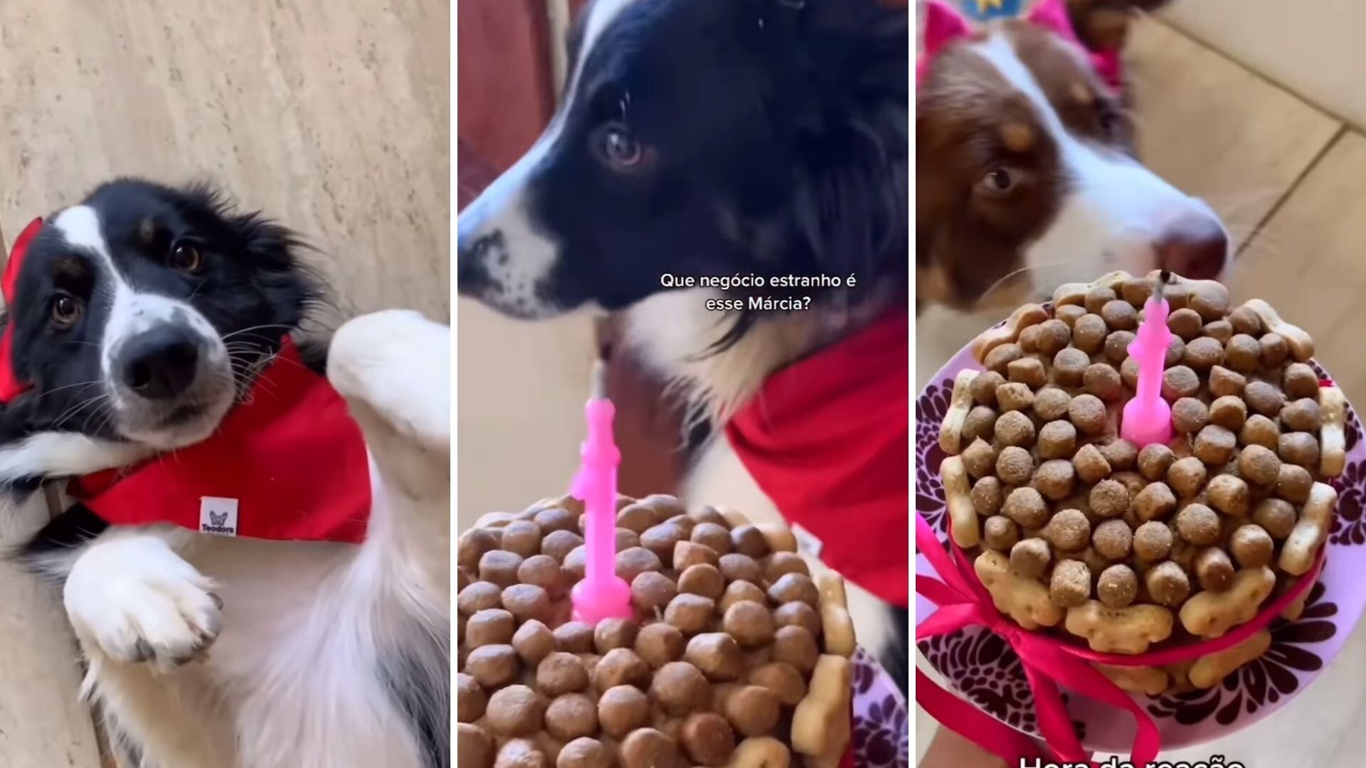 Dona utiliza ração para fazer ‘bolo de aniversário’ para cadela de estimação e reação inusitada do animal se torna viral nas redes sociais