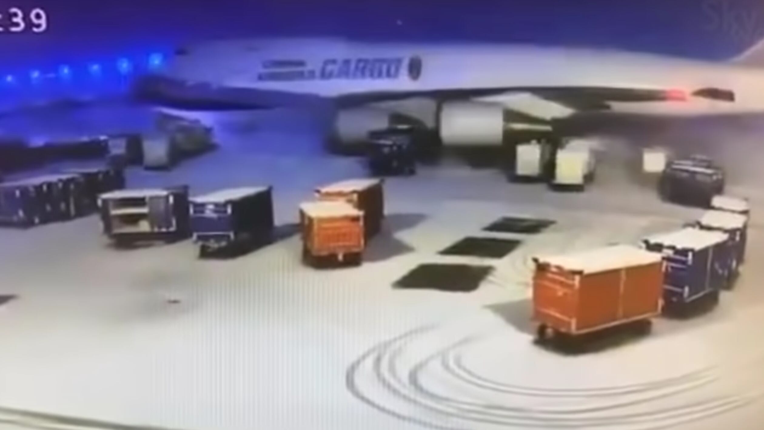 Um vídeo impressionante registrou o momento em que um avião gigante ‘descontrolado’ acaba colidindo com contêineres de carga, arrastando tudo por onde passa.