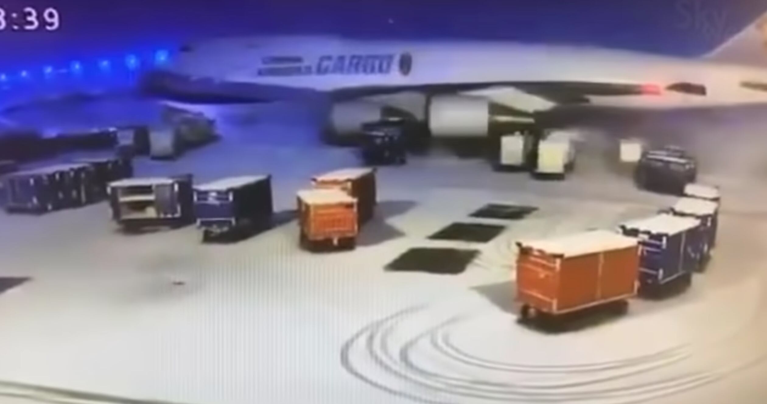 Um vídeo impressionante registrou o momento em que um avião gigante ‘descontrolado’ acaba colidindo com contêineres de carga, arrastando tudo por onde passa.