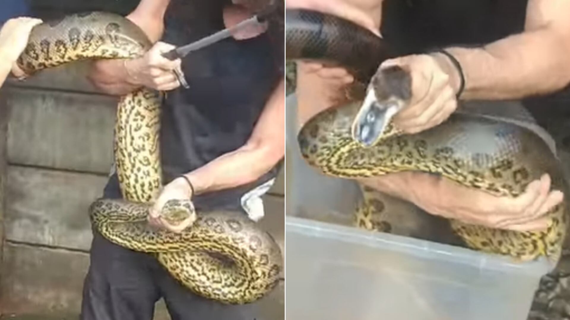 Ao tentar colocar a cobra em uma caixa para transportá-la, é possível ver que ela entra em modo de defesa e usa sua força, que não é pequena.