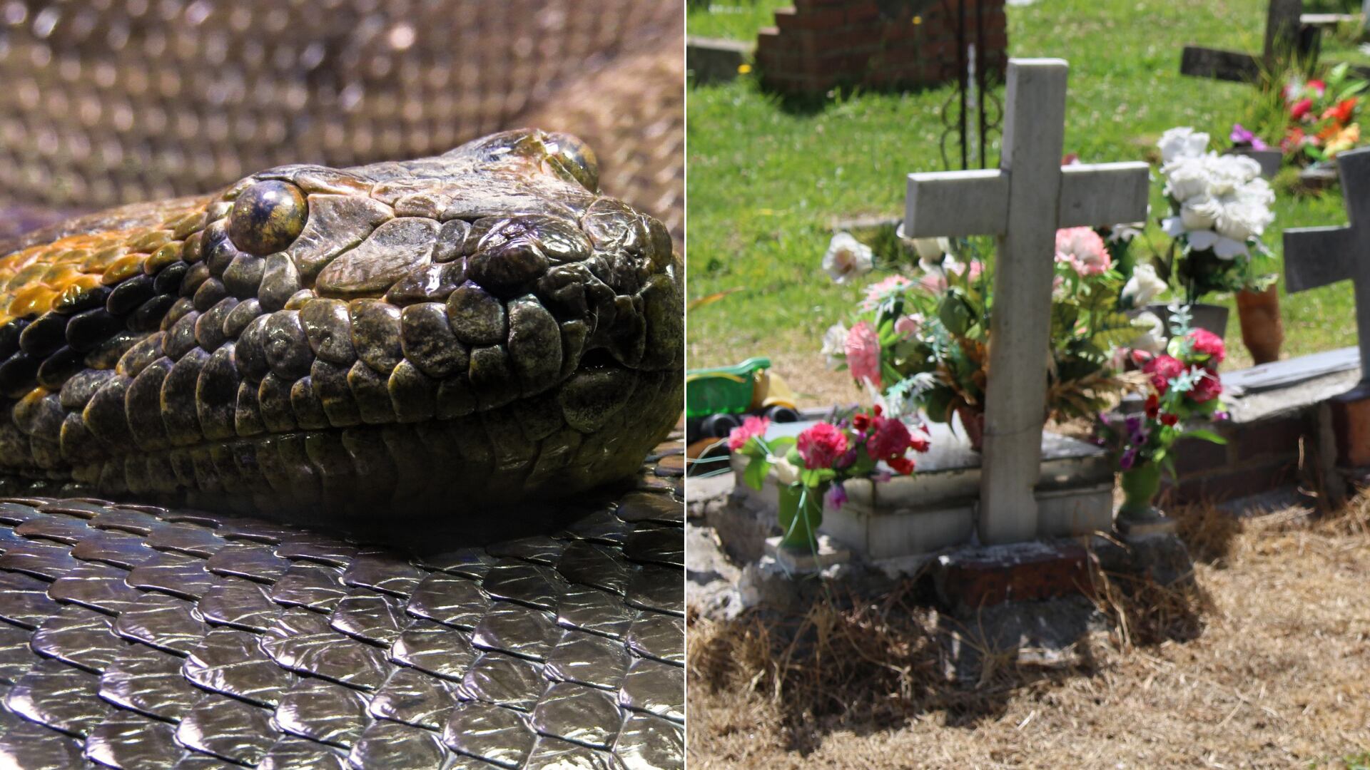 Moradores da cidade de Diamantino, no Mato Grosso, flagraram uma sucuri deslizando pelo muro do cemitério na cidade.