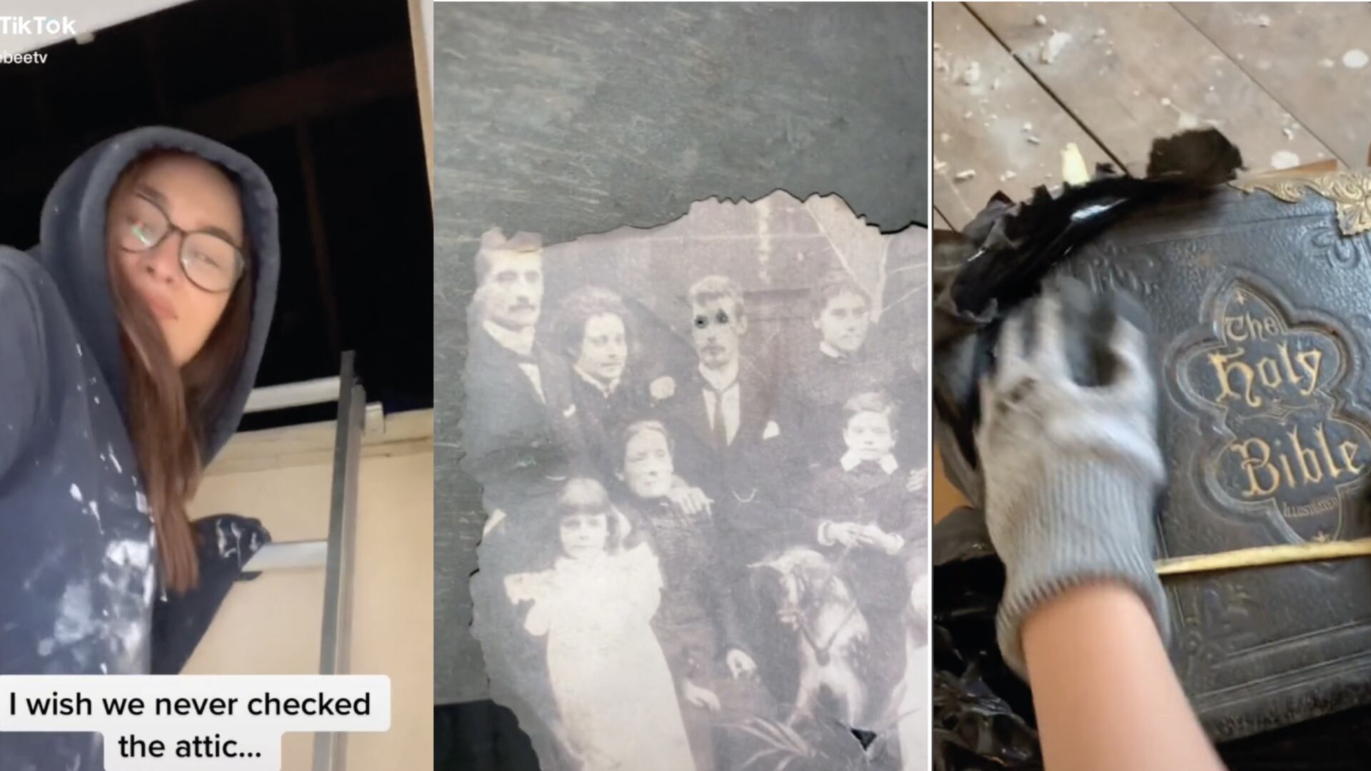 Na casa eles também encontraram um quarto escondido que estava cheio de objetos estranhos. “No início pensamos que estava vazio, mas vimos algo pendurado no teto, em um saco plástico”, disseram eles no TikTok. Dentro da bolsa, havia uma bíblia antiga com algumas cartas e cartões postais antigos.