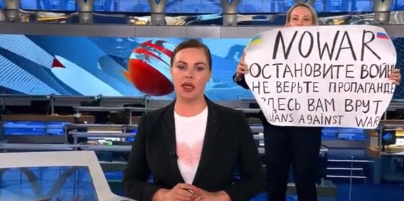 Durante sua aparição na transmissão, Marina segurava um cartaz com os dizeres: “Parem a guerra! Não acreditem na propaganda, eles estão mentindo para você!”.