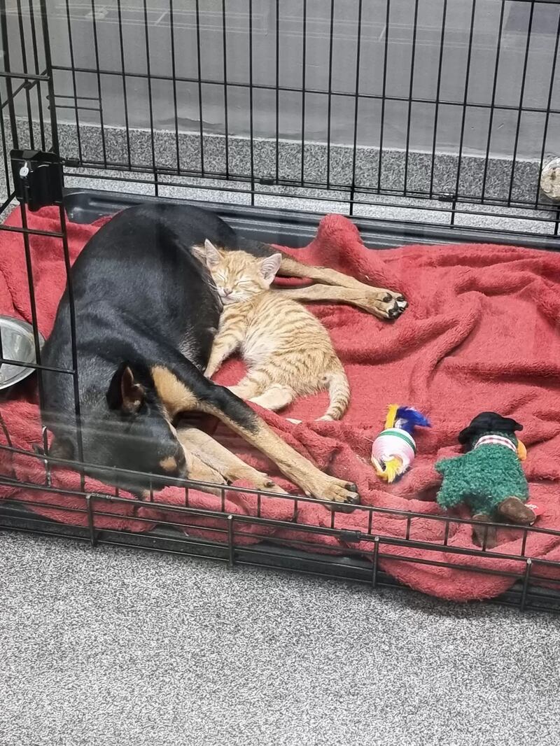 Certo dia, a equipe entrou na ala de isolamento e viu que Ginger não estava mais em sua caixa. O gatinho estava dentro da caixa de Anne, sendo aconchegado pela cachorrinha.