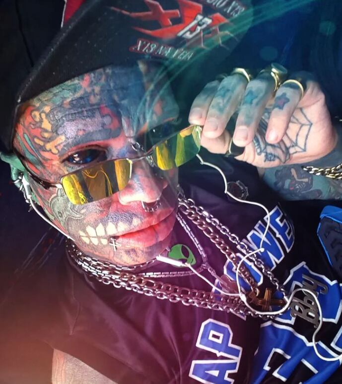 Já entre suas tatuagens, as mais extremas foram a coloração dos globos oculares e das gengivas com tinta preta.