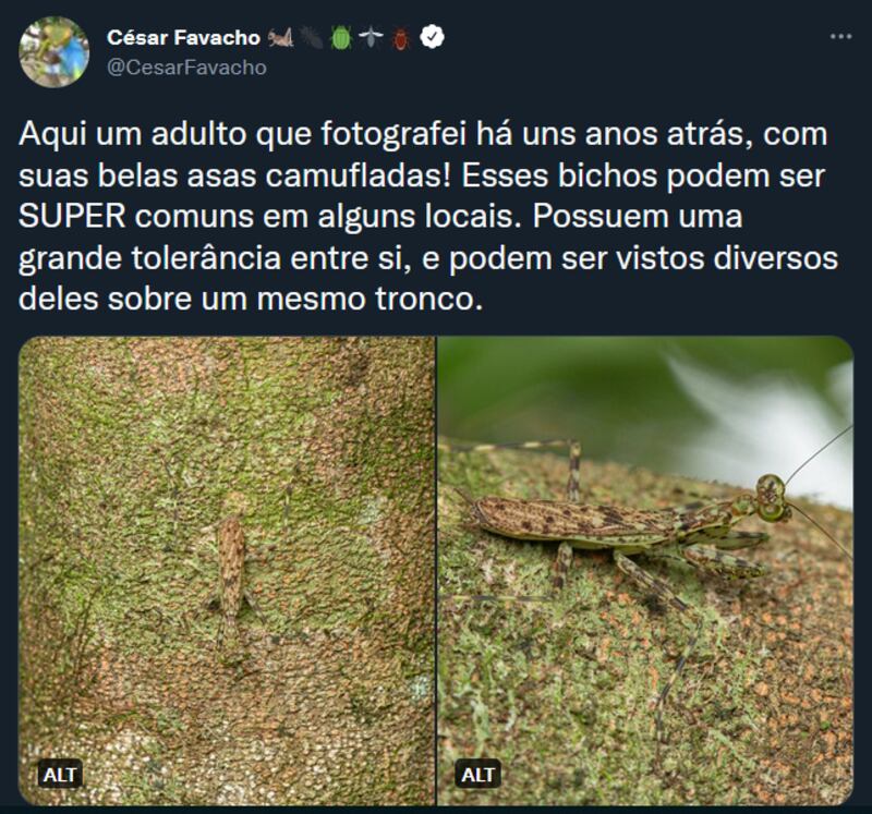 O profissional explica o louva-a-deus de tronco do gênero “Liturgusa”, é um bicho muito rápido e que viver em troncos se camuflando. O animal da imagem ainda é jovem e não possui asas.