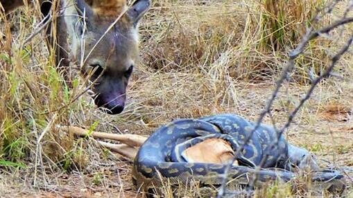 O vídeo que mostra como uma cobra píton enfrenta uma batalha contra uma hiena para poder comer a presa que caçou e matou voltou a se tornar viral.
