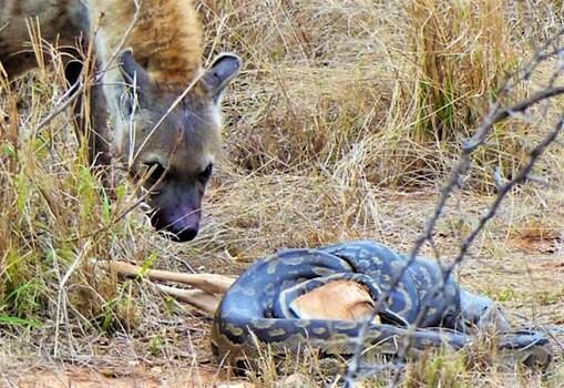A hiena agarra o filhote de impala e carrega os dois animais em sua boca, enquanto a píton prefere se refugiar em uma árvore.