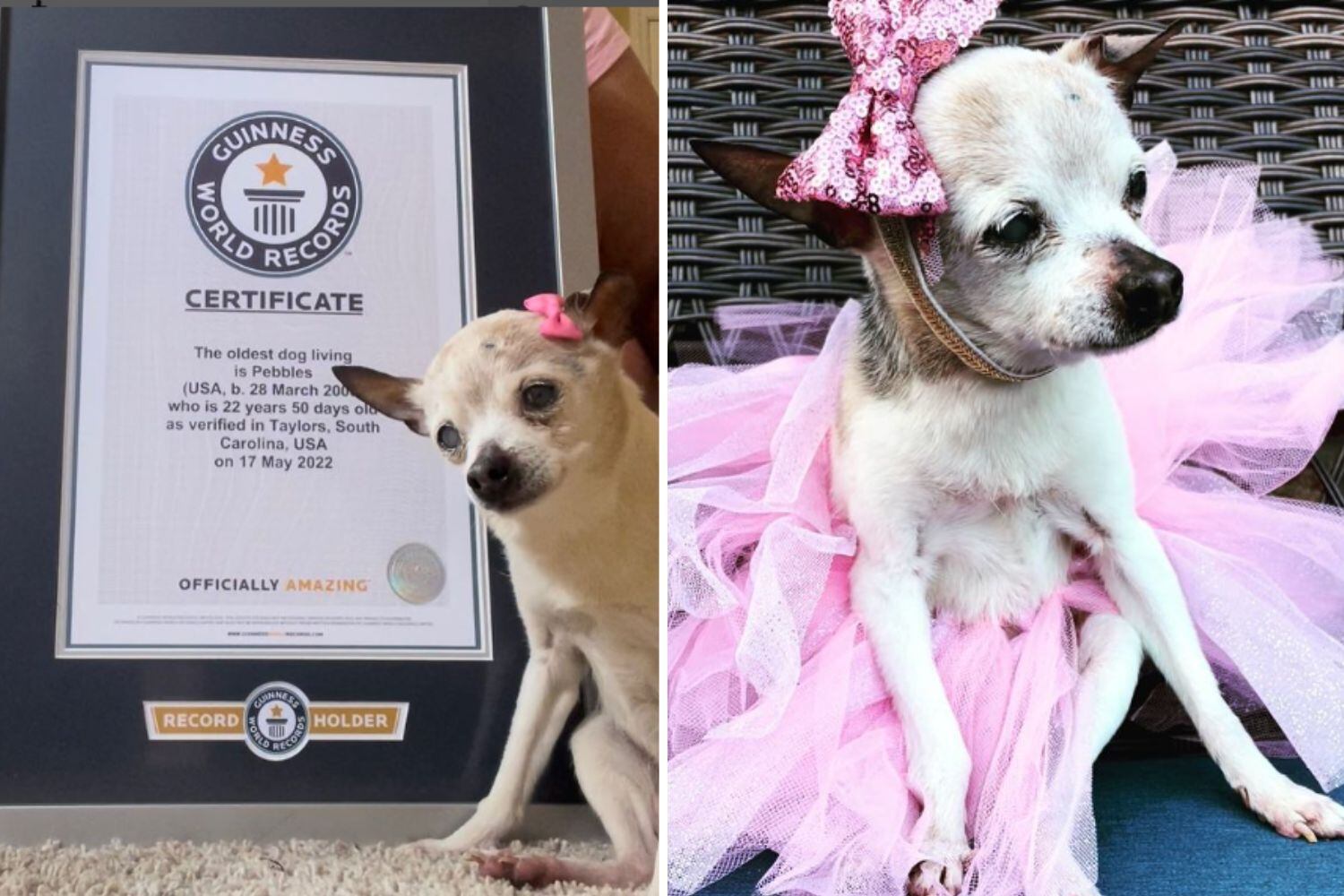 A cachorrinha Pebbles, da raça Toy Fox Terrier, foi reconhecida oficialmente pelo Guinness World Records, o Livro dos Recordes, como a cadela mais velha do mundo. Aos 22 anos, ela vive com seus donos, Bobby e Julie Gregory, na Carolina do Sul, nos Estados Unidos. A rotina do animal, que gosta de ouvir música country e comer pizza, é compartilhada nas redes sociais.