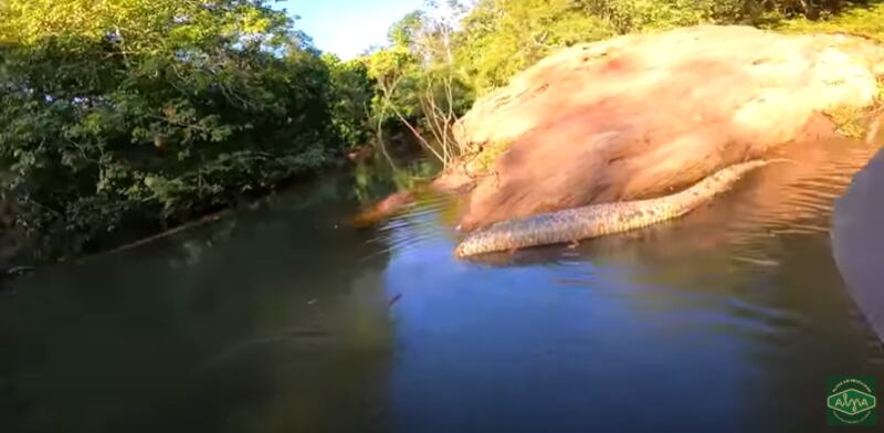 A cobra passou nadou próxima à embarcação e ele ainda teve coragem de entrar na água junto com a sucuri: “Olha a sucuri em baixo do caiaque! Meu deus, olha o tamanho da sucuri”, disse ao avistar o animal.