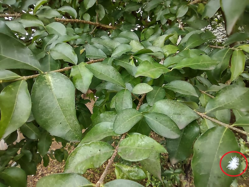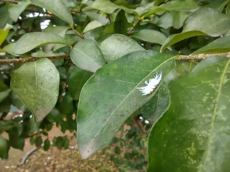 Olhando para esta foto, você consegue observar as folhas – de um pé de acerola. Contudo, estamos procurando pela lagarta branca felpuda. Você consegue apontar onde ela está dentro de 30 segundos? Observe bem a imagem!