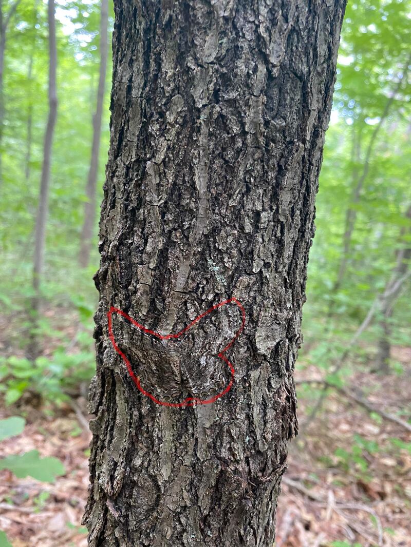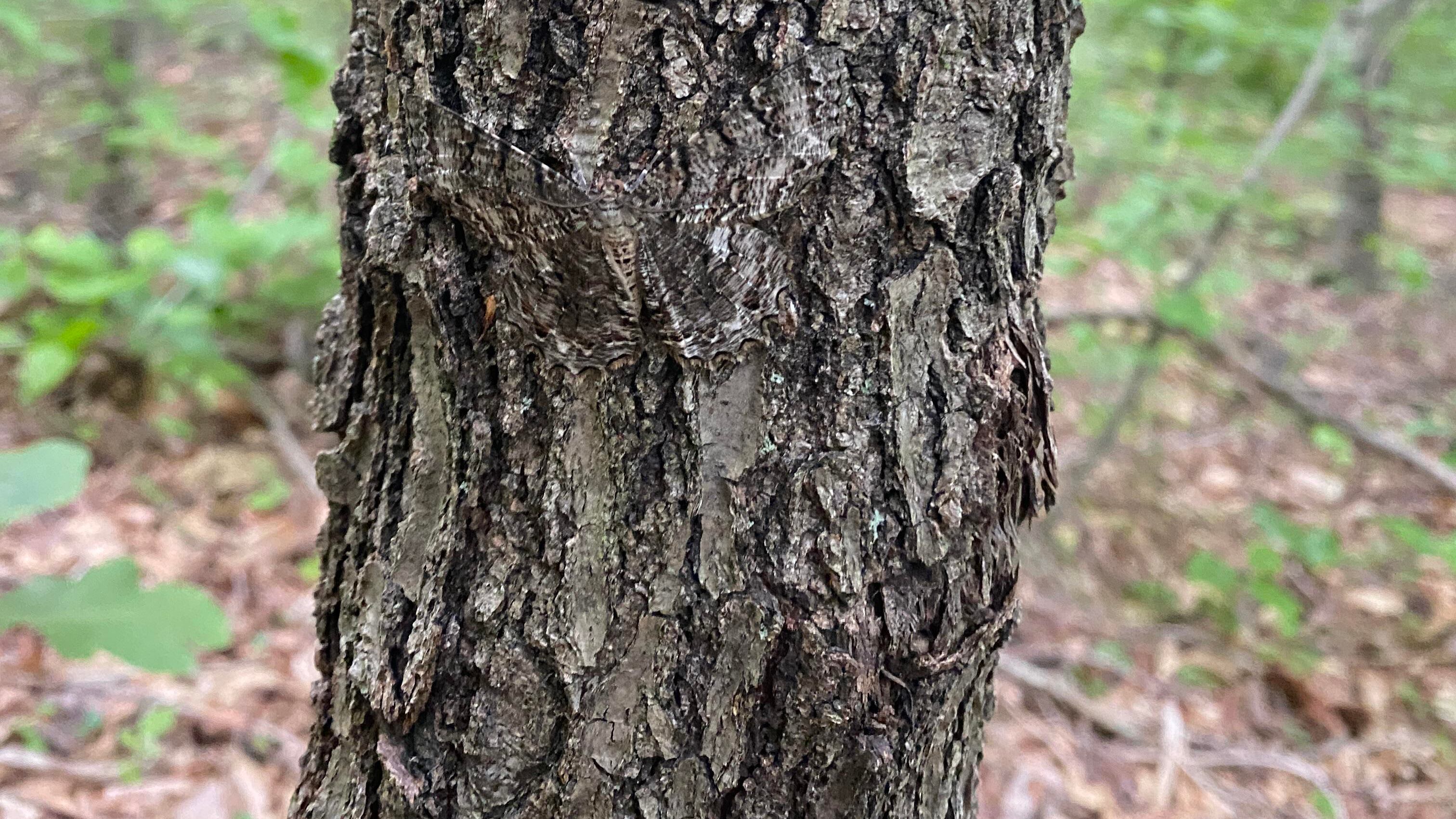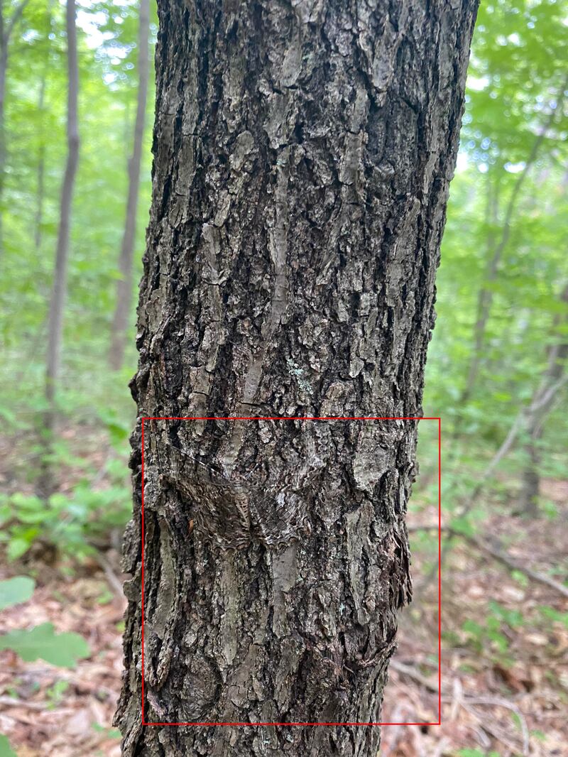 Olhando para esta foto, você consegue enxergar apenas o tronco de uma árvore, certo? Contudo, estamos procurando pela presença de uma mariposa – que se encontra no modo camuflagem – na foto. Você consegue apontá-la na imagem? Observe bem!