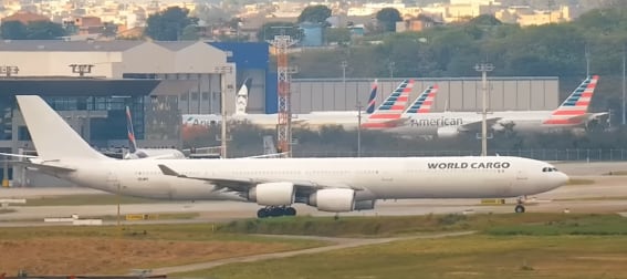 Neste último final de semana o Aeroporto de Guarulhos, em São Paulo recebeu uma rara ‘visita’. Considerado um dos maiores aviões comerciais em quesito comprimento do mundo, o Airbus A340-600, que de acordo com o site de aviação AEROIN, possui 75 metros de comprimento, está realizando o transporte de cargas no país.