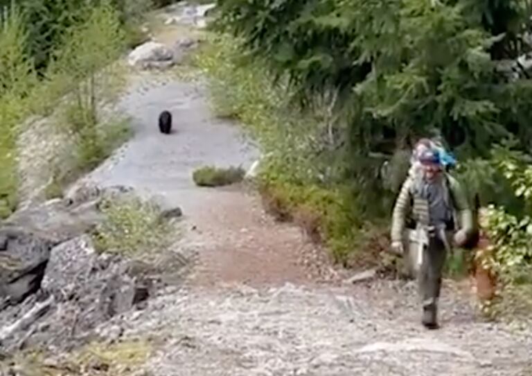 Um vídeo registrou o momento aterrorizante em que um urso persegue uma família de cinco pessoas por uma trilha no Canadá.
