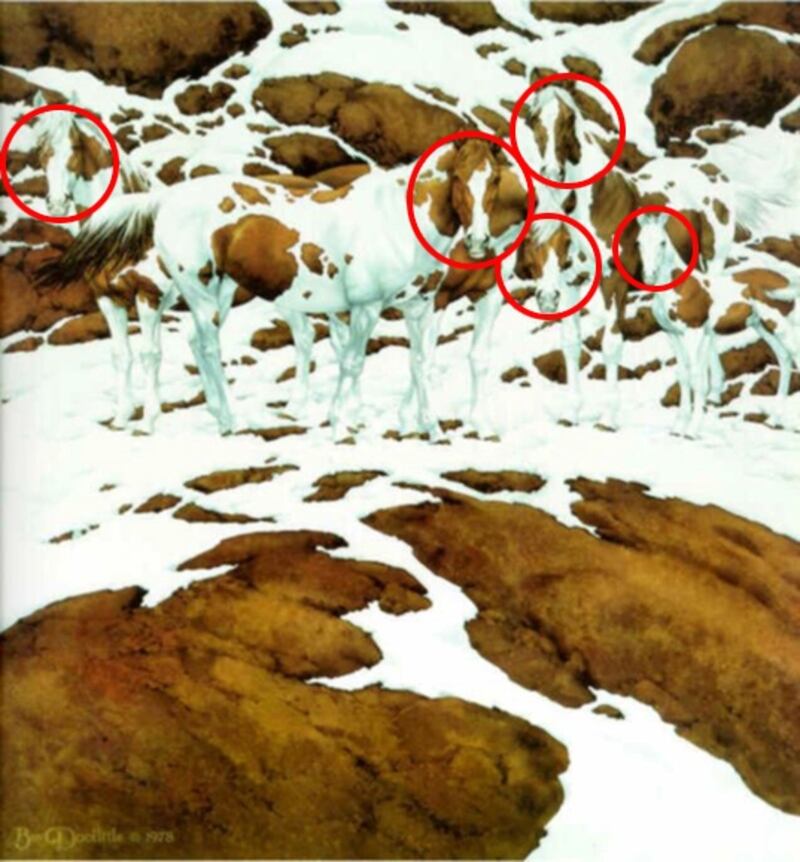 Não conseguiu identificar? Uma dica é procurar as cabeças dos animais. Há quem diga que são sete cavalos, mas a própria artista que desenhou afirmou serem apenas cinco.