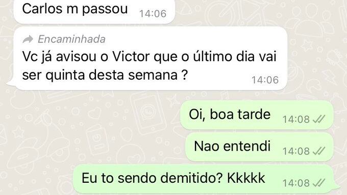Na legenda da publicação, Victor escreveu: “A demissão via WhatsApp foi totalmente profissional e madura”, e usou um emoji de palhaço. Logo, a história repercutiu nas redes sociais e ele passou a receber como resposta inúmeros outros casos de pessoas que também foram demitidas por meio de mensagens.