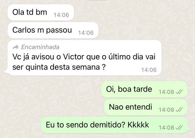 Na legenda da publicação, Victor escreveu: “A demissão via WhatsApp foi totalmente profissional e madura”, e usou um emoji de palhaço. Logo, a história repercutiu nas redes sociais e ele passou a receber como resposta inúmeros outros casos de pessoas que também foram demitidas por meio de mensagens.