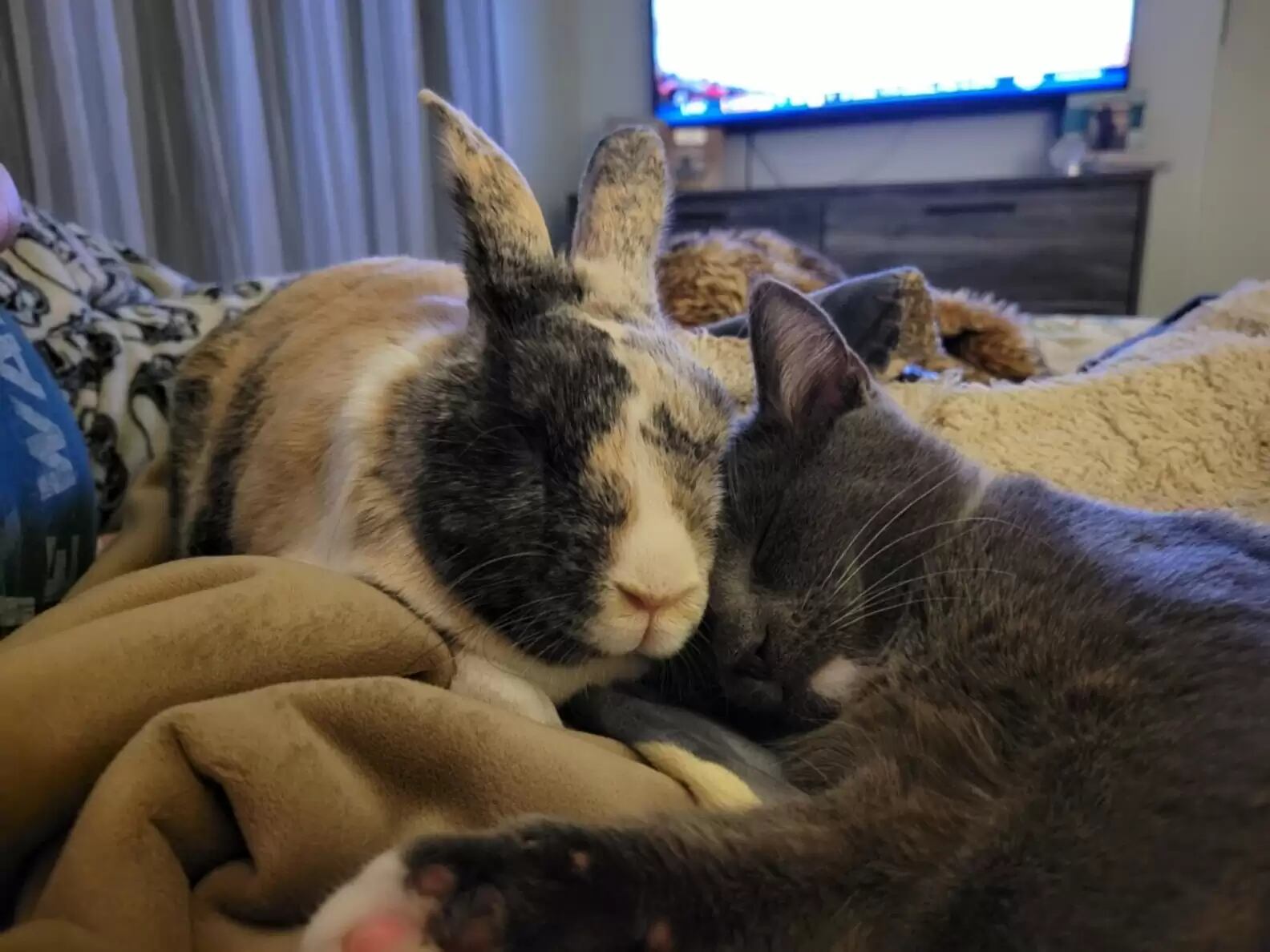 Embora o gato Ahsoka tenha seus irmãozinhos, a preferência pela amizade do coelho era nítida.