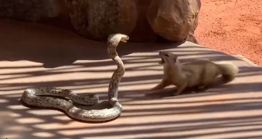 Mais uma vez um vídeo que mostra a luta entre um mangusto e uma cobra-rei surgiu no YouTube. A gravação mostra como os dois batalham intensamente e trocam atacas repetidas vezes até que um acabe desistindo e fugindo.