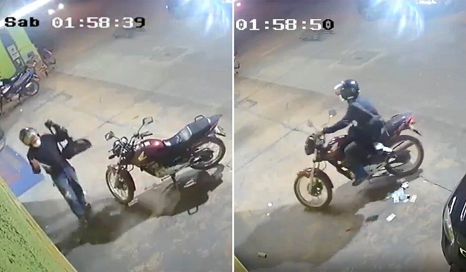 As imagens ainda registraram quando, já do lado de fora, ele sobe em uma motocicleta e foge, deixando todas as notas caírem no chão.