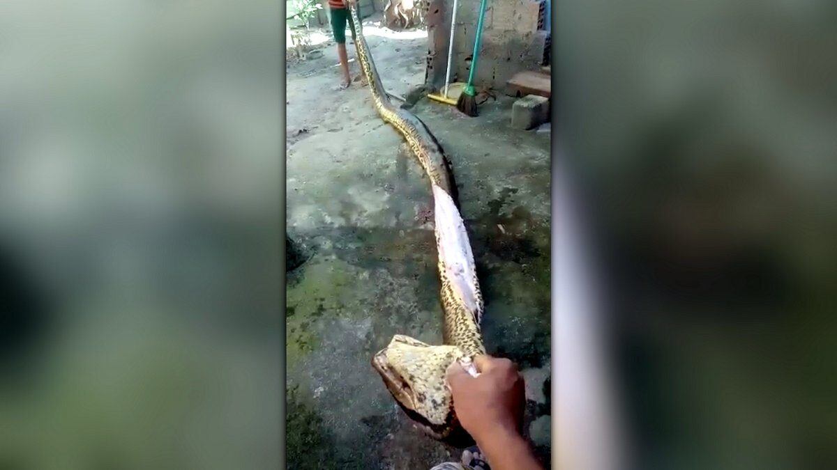 O vídeo que mostram um homem tirando o couro de uma sucuri, a segunda maior cobra do mundo e que também é conhecida como anaconda, está circulando nas redes sociais.