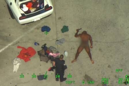 Minutos depois, nu, Brandon parou em um posto de gasolina e saiu do veículo calmamente para abastecer. Espantados, clientes do estabelecimento ligaram para a polícia, que mandou um equipe, com helicóptero.