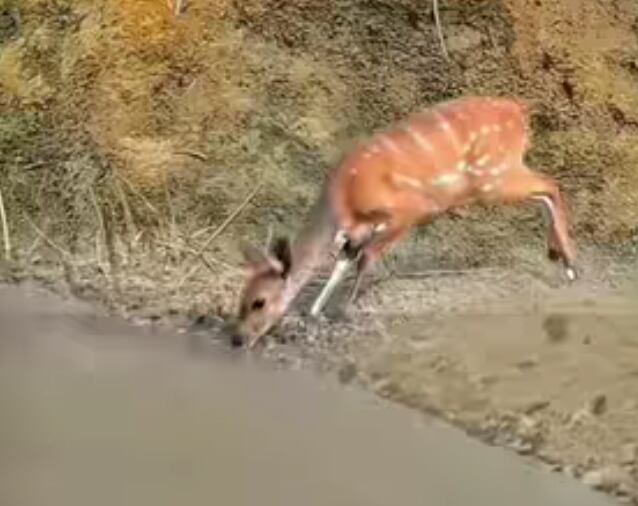 No registro, é possível ver um pequeno cervo tomando água tranquilamente, na beira de um rio.